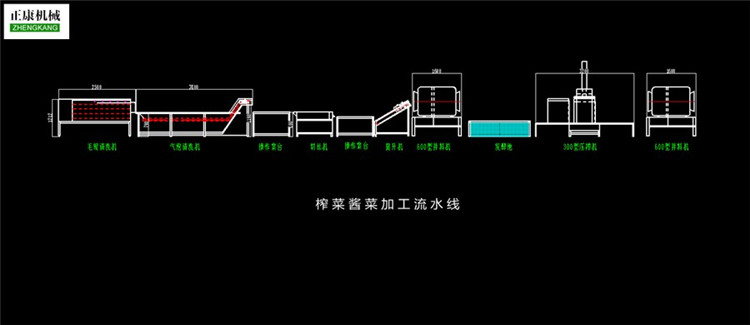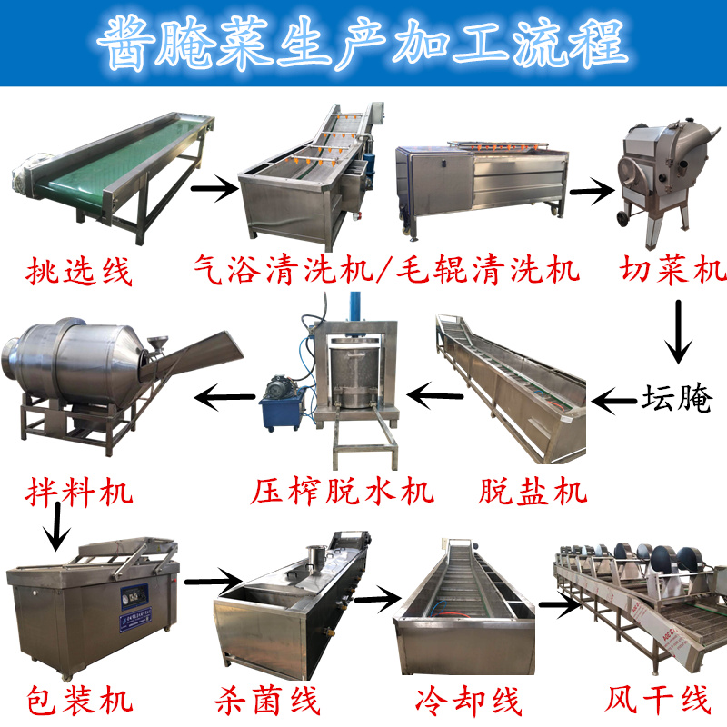 根据客户的流水线作业,先用毛辊清洗机将芥菜榨菜等用软毛清洗冲刷,地道表面泥土以及污垢。蔬菜从毛辊清洗机出来后直接进入到气泡清洗,经过气泡清洗机的二次清洗后,提升机跟案台高度相符,人工挑拣后,切丝机蔬菜切丝后,提升机直接送入滚筒拌料机,让芥菜榨菜充分入味后,发酵池发酵后,用液压压榨机压榨脱水,后经滚筒拌料机加入调料搅拌,酱菜加工完成。