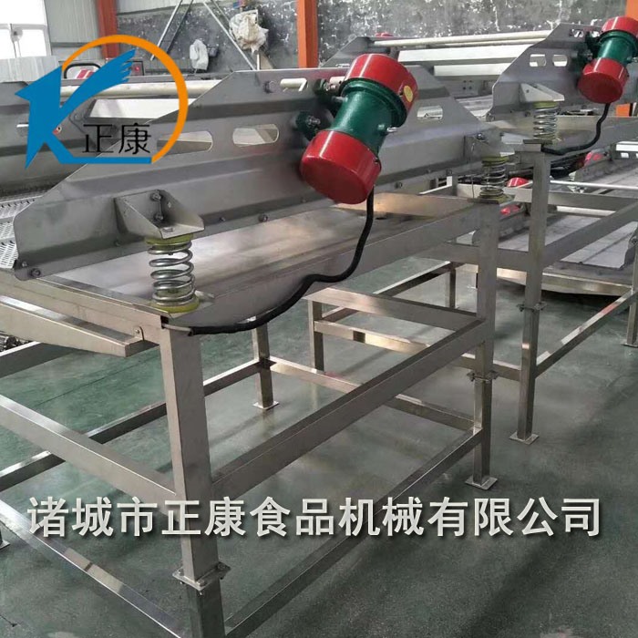 振动沥水机又叫沥水振动筛是一种常用的轻型振动沥水设备,该直线振动沥水筛是利用两台转向相反的振动电机激振的原理,使物料在筛面上作跳跃式直线运动。本机广泛应用于粮食、蔬菜、食品等各行各业中,适用于各种物料不同程度的分级和脱水作业。该设备也用于巴氏杀菌冷却后的食品包装袋表面除水,及蔬菜清洗后表面水分的去除。经振动沥水后,大部分水滴已被去除,剩余水份再经风干机吹干后便可装箱入库。